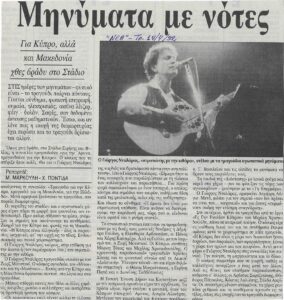 Τον Απρίλιο, πραγματοποιείται στο Στάδιο Ειρήνης και Φιλίας μια ακόμα μεγάλη συναυλία για την διαφώτιση γύρω από το Κυπριακό ζήτημα, με την συμμετοχή της Δήμητρας Γαλάνη, της Ελευθερίας Αρβανιτάκη, του Χάρη και του Πάνου Κατσιμίχα, των Κύπριων συνθετών Μάριου Τόκα και Μιχάλη Χριστοδουλίδη, του τραγουδιστή της Κυπριακής παράδοσης Χρήστου Σίκκη αλλά και του Ζωρζ Μουστακί.
